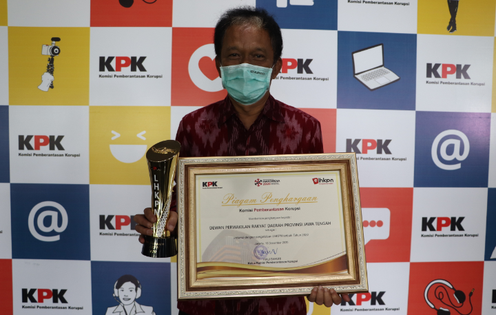 JAKARTA – DPRD Provinsi Jateng meraih penghargaan Laporan Hasil Kekayaan Penyelenggara Negara (LHKPN) 2020 dari Komisi Pemberantasan Korupsi (KPK) dalam acara Hari Antikorupsi Sedunia (Hakordia) 2020, Selasa (22/12/2020), di Gedung KPK Jalan HR Rasuna Said Jakarta. Dalam acara itu, Wakil Ketua KPK Nurul Gufron menyerahkan penghargaan tersebut kepada Ketua DPRD Provinsi Jateng Bambang Kusriyanto.