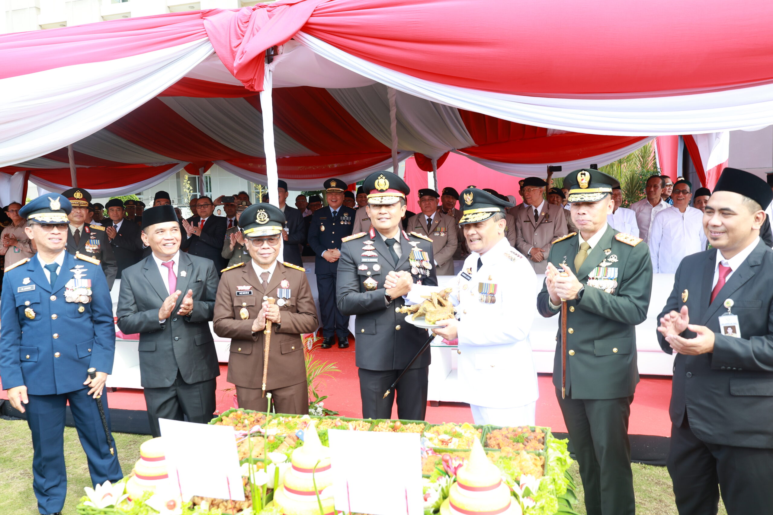 POTONG TUMPENG. Sumanto mendampingi gubernur dalam pemotongan tumpeng HUT Bhayangkara ke-79, Selasa (1/7/2025), di Polda Jateng. (foto rinto)