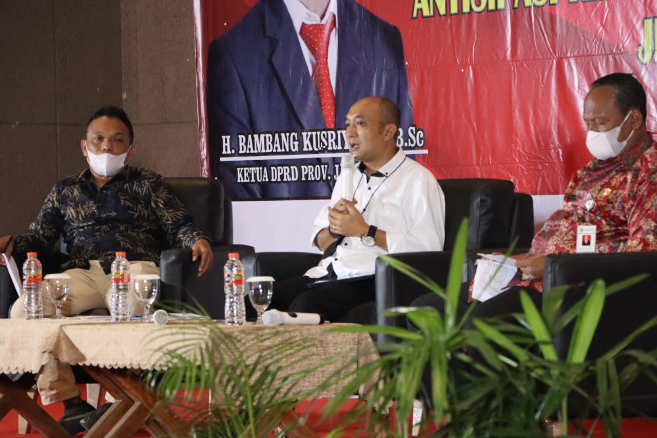 BICARA HARGA. Bondan Marutohening berbicara mengenai harga kebutuhan pokok masyarakat dan antisipasi lonjakan harga dalam FGD di Wujil Convention Hal. (foto priyanto)