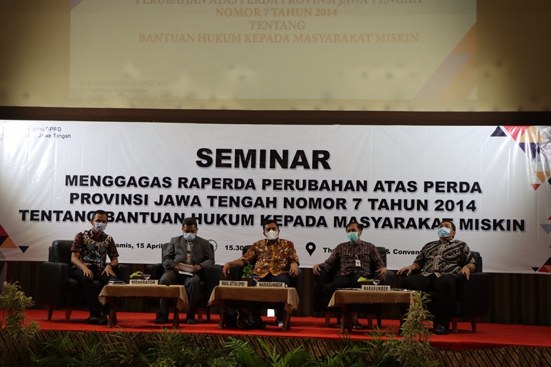 Penegasan tersebut disampaikan Kepala Kantor Wilayah Kemenkumham Jawa Tengah A Yuspahruddin saat memberi tanggapan dalam seminar “Menggagas Raperda Perubahan Atas Perda Provinsi Jawa Tengah Nomor 7 Tahun 2014 tentang Bantuan Hukum kepada Masyarakat Miskin” pada Kamis (15/4/2021), di The Wujil Resort & Convention, Ungaran.