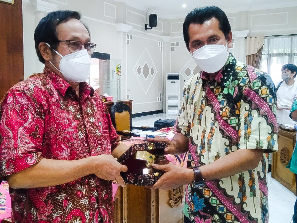 CENDERA MATA : Ketua Pansus DPRD Sriyanto Saputro menerima cendera mata dari DPRD Banyumas, Senin (5/4/2021).(foto: atson hade)