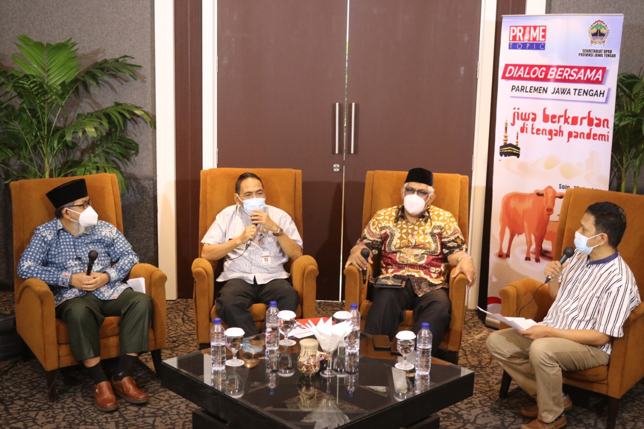 SUKOHARJO – Dinas Peternakan dan Kesehatan Hewan (Disnakkeswan) Jateng bersama kabupaten/kota diminta tetap memperketat pemantauan hewan ternak terutama dari luar daerah. Selama masa pandemi Covid-19 pun pedagang ternak juga diharapkan tak luput dari pemantauan. Hal tersebut mengemuka dalam dialog radio “Dialog Parlemen Prime Topic : Jiwa Berkurban di Tengah Pandemi” di Best Western Premiere Hotel, Sukoharjo (18/6/2021).