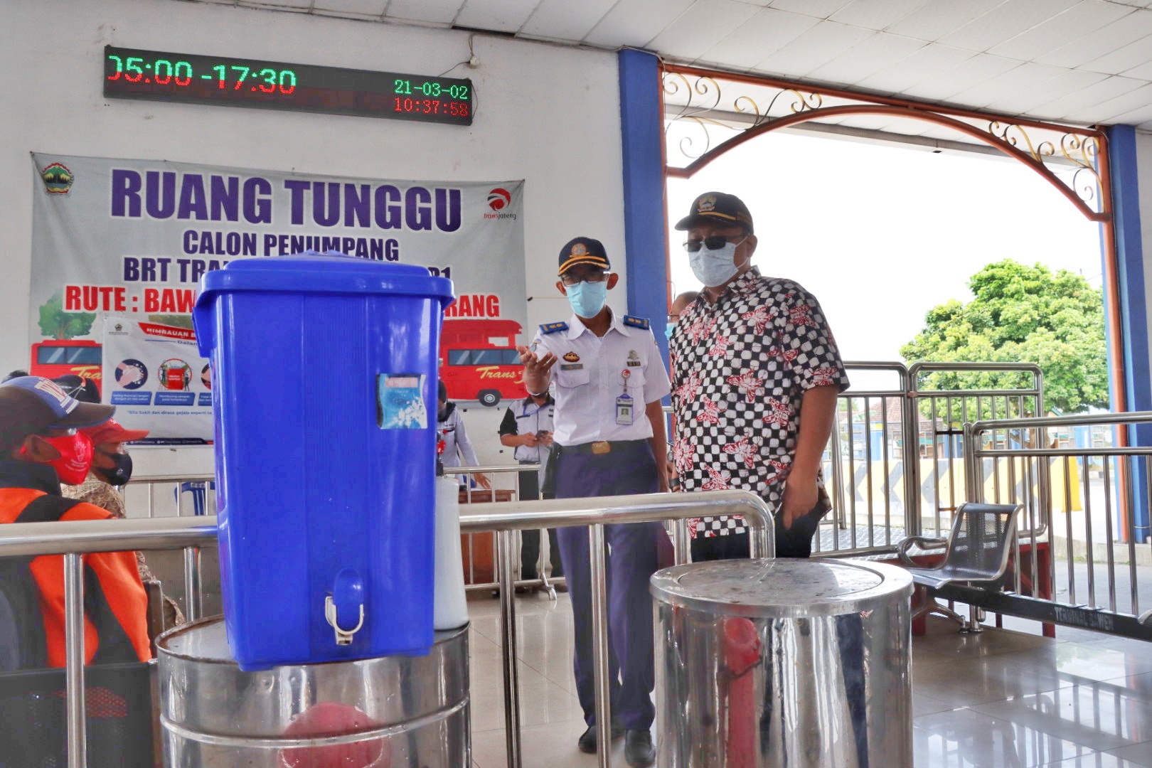 KUNJUNGAN LAPANGAN : Ketua Komisi D Alwin Basri melihat tempat cuci tangan bagian dari fasilitas protokol kesehatan di halte BRT Terminal Bawen.(foto: teguh prasetyo)