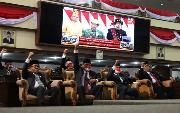 PIDATO PRESIDEN. Pimpinan DPRD, Gubernur & Wagub bersama pejabat forkompinda mendengarkan pidato kenegaraan presiden, Selasa (16/8/2022). (foto teguh prasetyo)