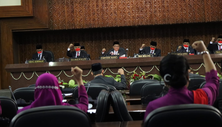 GEDUNG BERLIAN – Usai mendengarkan pidato kenegaraan presiden, rapat paripurna dilanjutkan dengan agenda pemandangan umum fraksi atas Raperda tentang Fasilitasi & Sinergitas Penyelenggaraan Pesantren. Dalam agenda itu, masing-masing fraksi menyerahkan laporan pemandangan umumnya kepada Pimpinan DPRD dan gubernur & wagub.