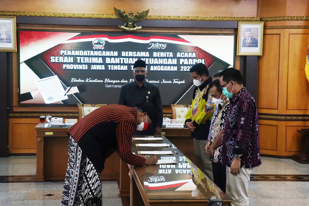 PENANDATANGANAN ACARA: Gubernur Ganjar Pranowo menandatangani acara penyerahan bantuan keuangan kepada parpol tahun anggaran 2022.(foto: chairul amin)