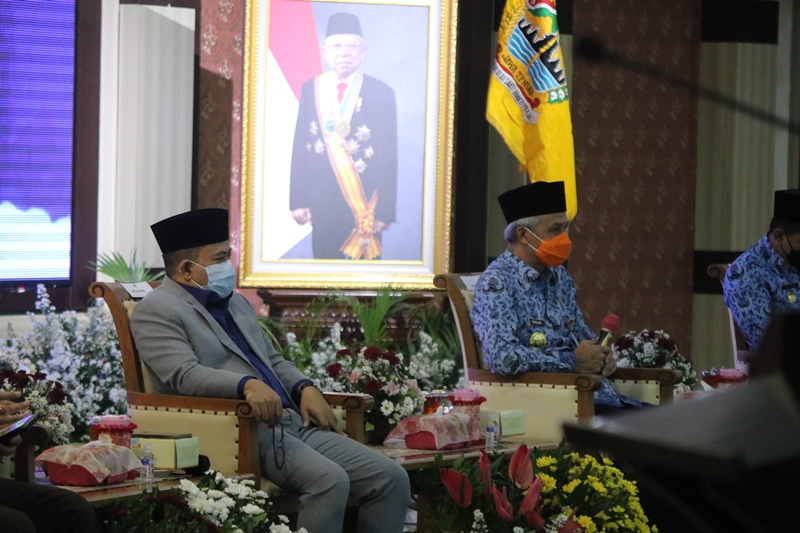 BERSAMA GUBERNUR. Sukirman (kiri) saat bersama Ganjar Pranowo dalam acara Halal bi Halal virtual di Grhadika Bakti Praja.(foto: fais fuadi)