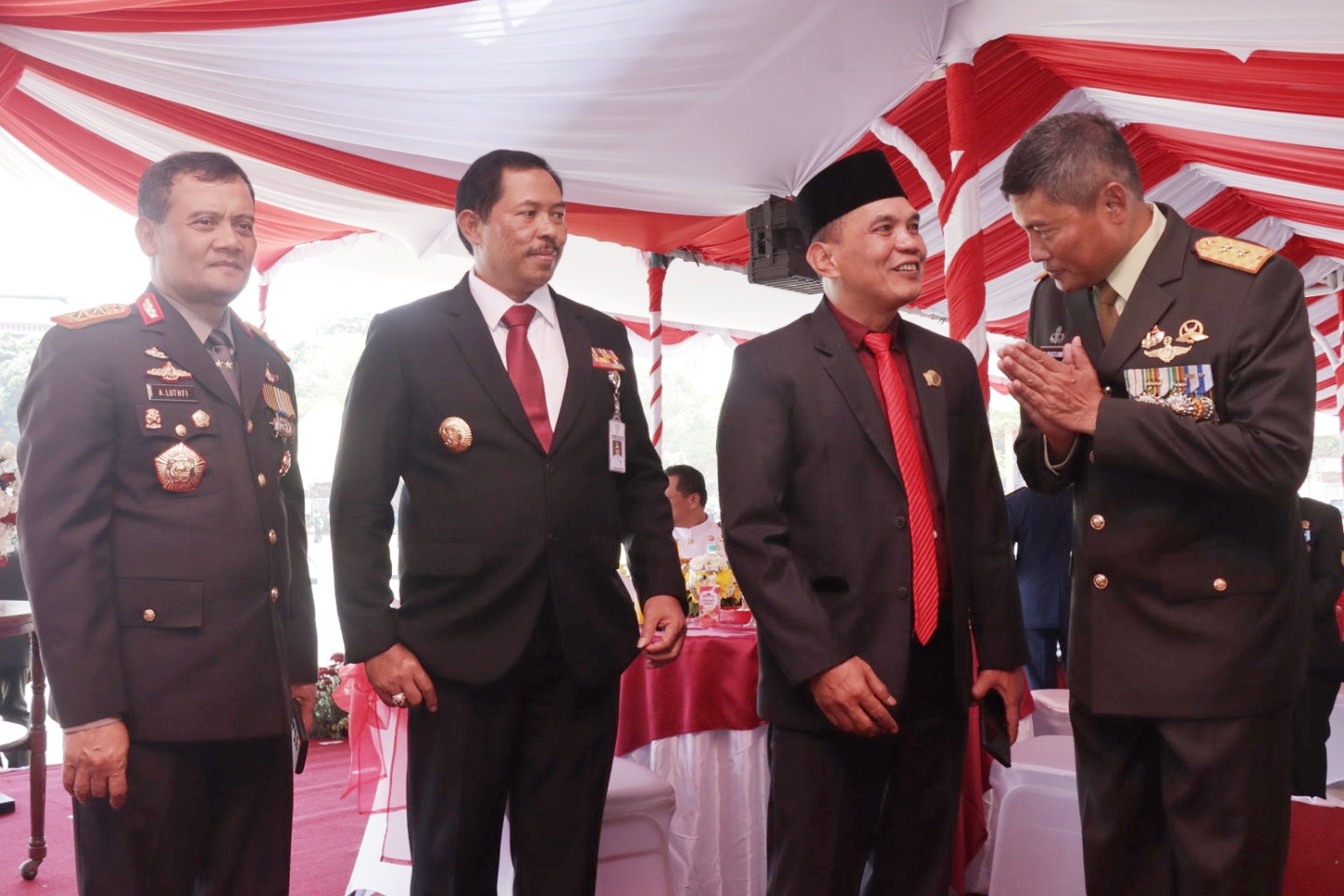 BINCANG-BINCANG: Ketua DPRD Sumanto sedang berbicang dengan Pangdam IV Diponegoro Mayjen TNI Widi Prasetijono. Turut bersamanya Pj Gubernur Nana Sudjana dan Kapolda Irjen A Lutfi di Lapangan Makodam Diponegoro.(foto: teguh prasetyo)